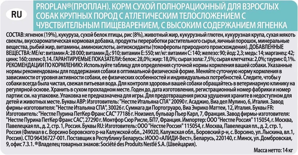 Pro Plan Adult Large Athletic Sensitive Digestion (Про План Эдалт Лапдж Атлетик Сенситив Дигестион) сухой ГИПОАЛЛЕРГЕННЫЙ корм для собак крупных пород от 25 кг с атлетическим телосложением и с чувствительным пищеварением (Ягненок)